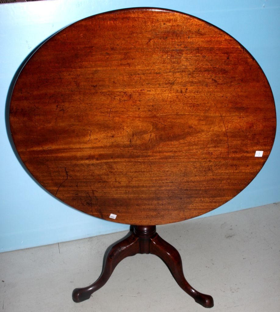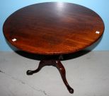 Nineteenth century mahogany English tea table with round top on pedestal base with padded feet; 35 1/2" dia., 30" h. Nineteenth century mahogany English tea table with round top on pedestal base with padded feet; 35 1/2" dia., 30" h.
