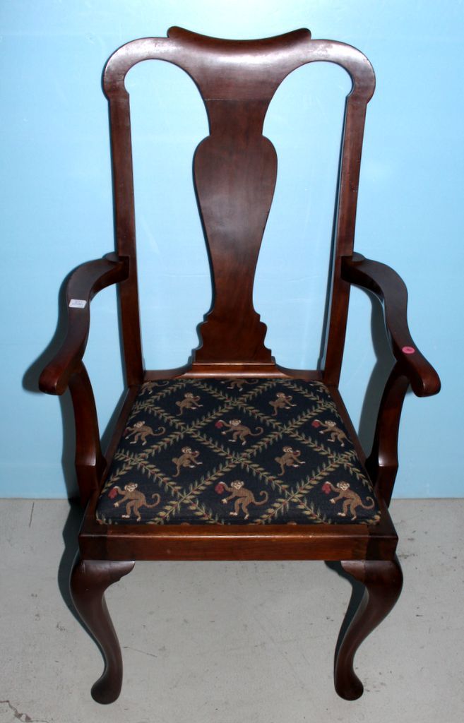 Reproduction queen ann style library chair on pad feet with monkey fabric; 22 1/2" w., 20" d., 46" h. Reproduction queen ann style library chair on pad feet with monkey fabric; 22 1/2" w., 20" d., 46" h.