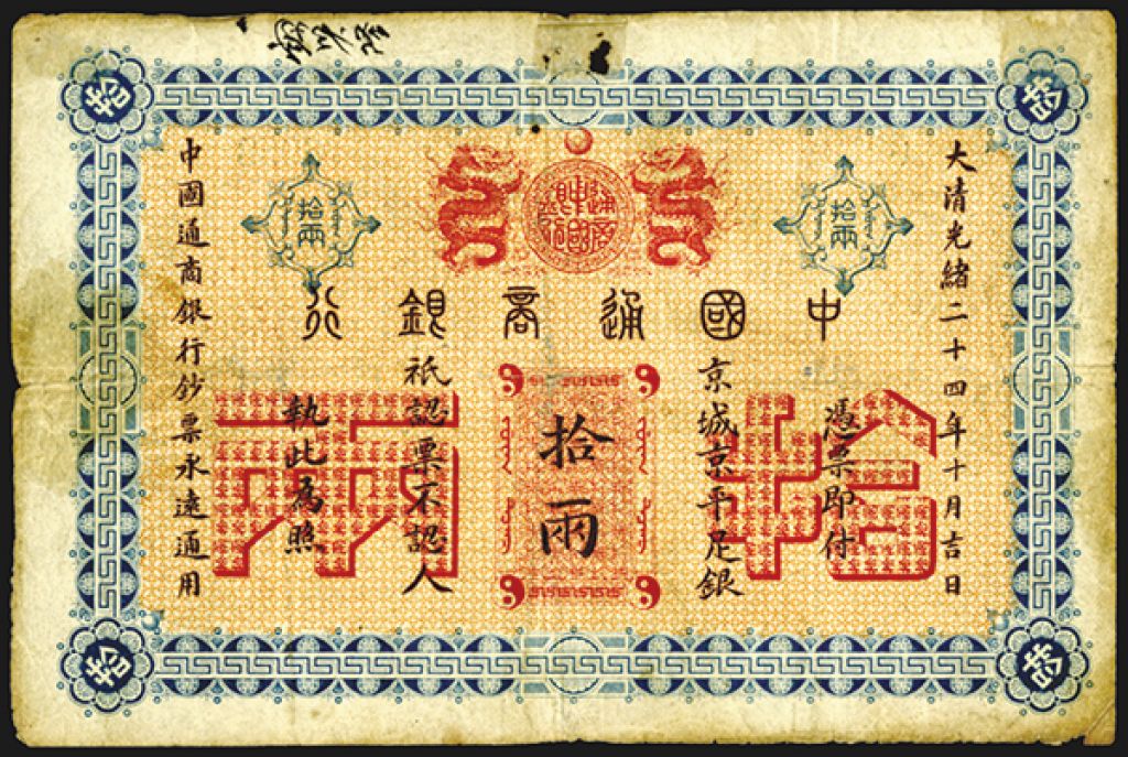 Imperial Bank of China, 1898 Peking Branch Taels Issue. China, 14th November, 1898, 10 Taels, P-A42a, S/M#C293-4b, Issued banknote, brown text with blue border on light orange underprint, facing dragons flank seal on top, S/N 6958, Choice Fine condition with a small stamp hinge on the top back middle margin that could easily be removed. Extremely rare note that is seldom seen at auction and is the first example of this type that we have offered. Worthy of a superior bid. BFL. Imperial Bank of China, 1898 Peking Branch Taels Issue. China, 14th November, 1898, 10 Taels, P-A42a, S/M#C293-4b, Issued banknote, brown text with blue border on light orange underprint, facing dragons flank seal on top, S/N 6958, Choice Fine condition with a small stamp hinge on the top back middle margin that could easily be removed. Extremely rare note that is seldom seen at auction and is the first example of this type that we have offered. Worthy of a superior bid. BFL.