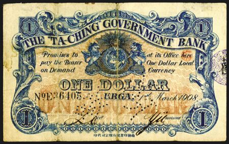 Ta-Ching Government Bank, 1908 "Urga" Branch Issue. China, $1, P-A75, S/M#T10-20, Issued banknote, face green and lilac, back Blue on light brown color with supported arms upper center, S/N E36405, Pin punch Chinese characters in middle, Choice Fine to VF with 4 areas of tape stain on the top margin, extremely rare note in any condition and unpriced in the SCWPM. First time offered by our company. Ta-Ching Government Bank, 1908 "Urga" Branch Issue. China, $1, P-A75, S/M#T10-20, Issued banknote, face green and lilac, back Blue on light brown color with supported arms upper center, S/N E36405, Pin punch Chinese characters in middle, Choice Fine to VF with 4 areas of tape stain on the top margin, extremely rare note in any condition and unpriced in the SCWPM. First time offered by our company.