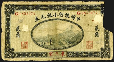 Bank of China, 1914 "Manchuria" Branch Issue Rarity. China, 20 cents, P-36c, S/M#C294-60, Issued banknote, Black o light green underprint with Great Wall at center, back orange, VG condition but there are two small areas of ink loss on the left and right of the face that has not effected the paper, only the undertint ink, as well as 4 small pin holes on the upper right. Unfortunately, there is a 1/2 by 1 inch piece missing from the top right corner. Rare note in any condition. Bank of China, 1914 "Manchuria" Branch Issue Rarity. China, 20 cents, P-36c, S/M#C294-60, Issued banknote, Black o light green underprint with Great Wall at center, back orange, VG condition but there are two small areas of ink loss on the left and right of the face that has not effected the paper, only the undertint ink, as well as 4 small pin holes on the upper right. Unfortunately, there is a 1/2 by 1 inch piece missing from the top right corner. Rare note in any condition.