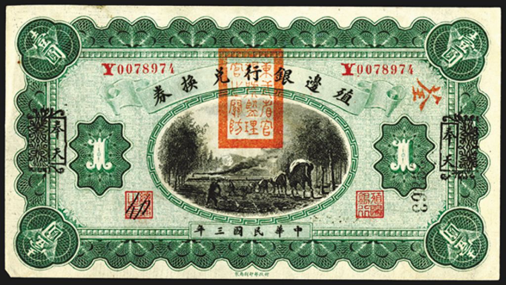 Bank of Territorial Development, ND 1914 "Moukden-Yunnan" Branch Issue. China. $1, P-566n, S/M#C165-3b, Issued banknote, green and black with workers and camel in middle and rectangular seal in middle and black text on left and right, back green, Uncirculated with bright colors, large even margins and sharp corners, rare branch issue. BEPP. Bank of Territorial Development, ND 1914 "Moukden-Yunnan" Branch Issue. China. $1, P-566n, S/M#C165-3b, Issued banknote, green and black with workers and camel in middle and rectangular seal in middle and black text on left and right, back green, Uncirculated with bright colors, large even margins and sharp corners, rare branch issue. BEPP.
