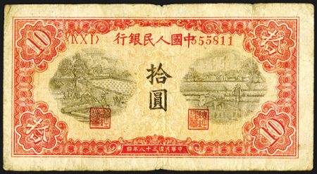 Peoples Bank of China, 1949 Issue Banknote. China, 1949, 10 Yuan, P-815 (S/M#C282-25), Block 9 10 1 (IX X I), S/N 55811, Issued banknote, red and black, Fine. Peoples Bank of China, 1949 Issue Banknote. China, 1949, 10 Yuan, P-815 (S/M#C282-25), Block 9 10 1 (IX X I), S/N 55811, Issued banknote, red and black, Fine.
