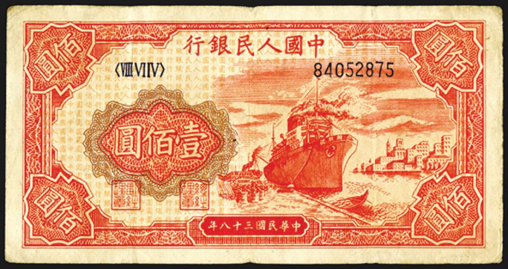 Peoples Bank of China, 1949 Issue. China, 100 Yuan, P-831 (S/M#C282-43), Issued banknote, Red on orange underprint, ship dockside at right, back with red on orange underprint, Block VIII VI IV (864), S/N 84052875, Choice Fine to VF. Peoples Bank of China, 1949 Issue. China, 100 Yuan, P-831 (S/M#C282-43), Issued banknote, Red on orange underprint, ship dockside at right, back with red on orange underprint, Block VIII VI IV (864), S/N 84052875, Choice Fine to VF.