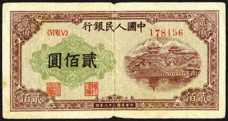 Peoples Bank of China, 1949 Issue. 200 Yuan, P-837 (S/M#C282-51), Issued banknote, Lilac brown with green guilloche, back brown on light olive underprint, Block 675 (VI VII V), S/N 178156, VF. Peoples Bank of China, 1949 Issue. 200 Yuan, P-837 (S/M#C282-51), Issued banknote, Lilac brown with green guilloche, back brown on light olive underprint, Block 675 (VI VII V), S/N 178156, VF.