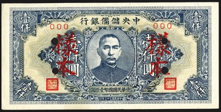Central Reserve Bank of China, 1944 Specimen Issue. China, 1000 Yuan, P-J33s, Specimen banknote, 169mm x 84mm, SYS at center, Yang Pen on face, Specimen on back, S/N 000, AU to Uncirculated condition, Scarce as specimen. Central Reserve Bank of China, 1944 Specimen Issue. China, 1000 Yuan, P-J33s, Specimen banknote, 169mm x 84mm, SYS at center, Yang Pen on face, Specimen on back, S/N 000, AU to Uncirculated condition, Scarce as specimen.