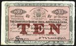 Chartered Bank of India, Australia & China 1928 "Tientsin" Branch Issue, One of Two Sequential Notes. Tientsin, China. 2nd January, 1928, $10, P-S203A, (S/M #Y11-31D). Issued banknote. Black border and text with purple underprint, Supported arms at top, purple "TEN" in middle, back black, One of two sequential banknotes being offered, S/N G/T 83594, Crisp Choice AU with light handling, a very light vertical fold in the middle and slight toning on the right back margin keeping this lovely note from Uncirculated, Rare in this high of grade. WWS&Co. Chartered Bank of India, Australia & China 1928 "Tientsin" Branch Issue, One of Two Sequential Notes. Tientsin, China. 2nd January, 1928, $10, P-S203A, (S/M #Y11-31D). Issued banknote. Black border and text with purple underprint, Supported arms at top, purple "TEN" in middle, back black, One of two sequential banknotes being offered, S/N G/T 83594, Crisp Choice AU with light handling, a very light vertical fold in the middle and slight toning on the right back margin keeping this lovely note from Uncirculated, Rare in this high of grade. WWS&Co.