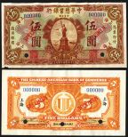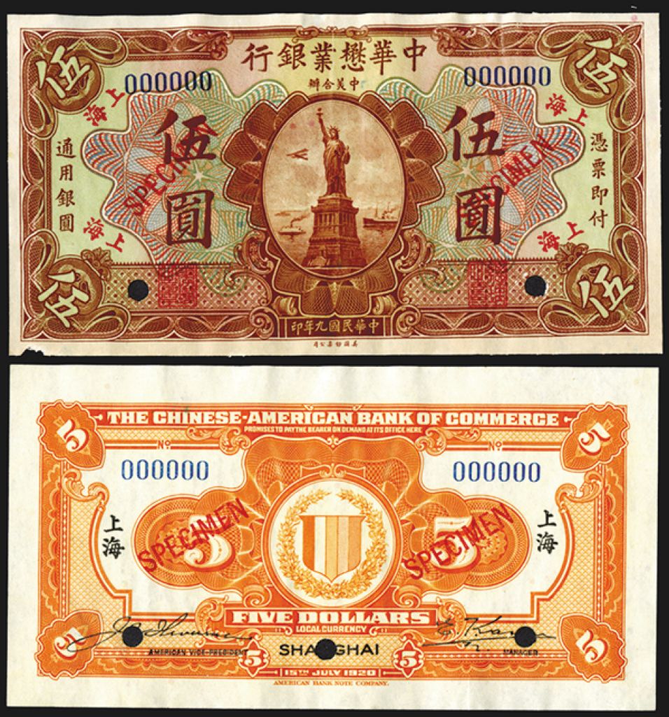 Chinese-American Bank of Commerce, 1920 "Shanghai" Issue Specimen. China, 1920. $5. P-S236s2. (S/M #C271-3d). Uniface Face and back banknotes, Specimen banknote. Brown on m/c underprint with Statue of liberty vignette in middle. Red specimen overprint, "00000" serial numbers and POC's. The face is XF with a small chip off of the lower left corner and the paper slightly wavy, the back is AU with a small thin. Rare Shanghai issue. ABNC. Chinese-American Bank of Commerce, 1920 "Shanghai" Issue Specimen. China, 1920. $5. P-S236s2. (S/M #C271-3d). Uniface Face and back banknotes, Specimen banknote. Brown on m/c underprint with Statue of liberty vignette in middle. Red specimen overprint, "00000" serial numbers and POC's. The face is XF with a small chip off of the lower left corner and the paper slightly wavy, the back is AU with a small thin. Rare Shanghai issue. ABNC.