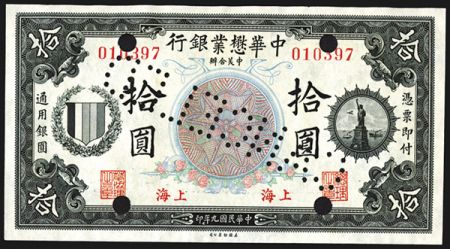 Chinese-American Bank of Commerce, 1920 Specimen Banknote. Shanghai, China, 15th July 1920. $10 Local Currency. P-S232s2, S/M#C271-4d, Shanghai Branch, Specimen banknote, Black on m/c face with portrait of Statue of Liberty on right, Back is green. AU condition. Pin-punch specimen, red specimen overprint, regular serial numbers "010397". Rarely seen Shanghai branch issue. ABNC. Chinese-American Bank of Commerce, 1920 Specimen Banknote. Shanghai, China, 15th July 1920. $10 Local Currency. P-S232s2, S/M#C271-4d, Shanghai Branch, Specimen banknote, Black on m/c face with portrait of Statue of Liberty on right, Back is green. AU condition. Pin-punch specimen, red specimen overprint, regular serial numbers "010397". Rarely seen Shanghai branch issue. ABNC.