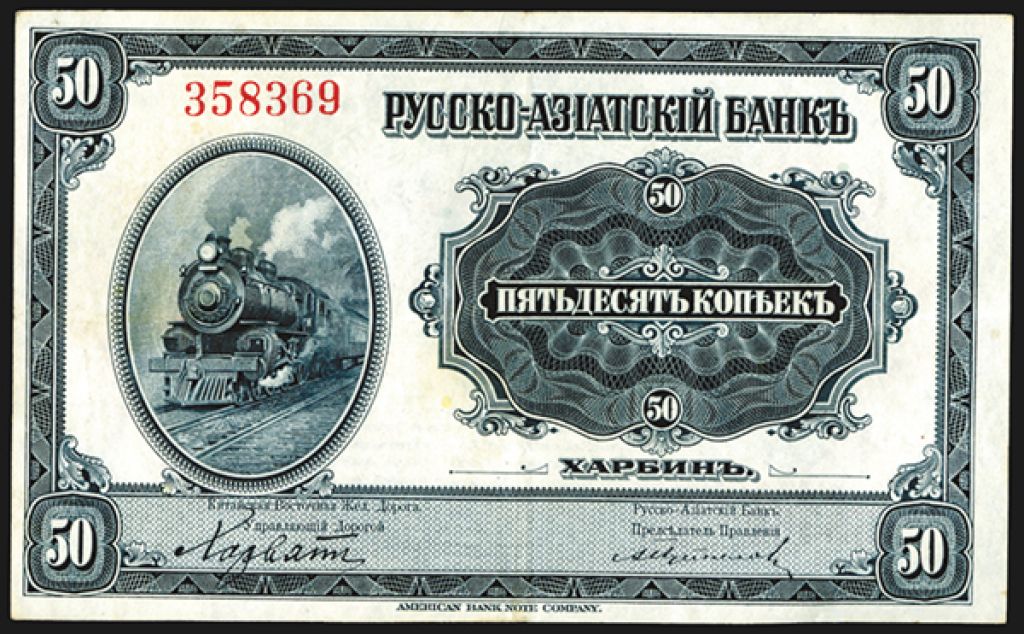 Russo-Asiatic Bank, ND 1917 "Harbin" Issue. China, 50 Kopeks, P-S473, S/M#O5-100, Issued banknote, Locomotive at left, back green and orange-red, Choice VF, possibly pressed, Attractive note. ABNC. Russo-Asiatic Bank, ND 1917 "Harbin" Issue. China, 50 Kopeks, P-S473, S/M#O5-100, Issued banknote, Locomotive at left, back green and orange-red, Choice VF, possibly pressed, Attractive note. ABNC.