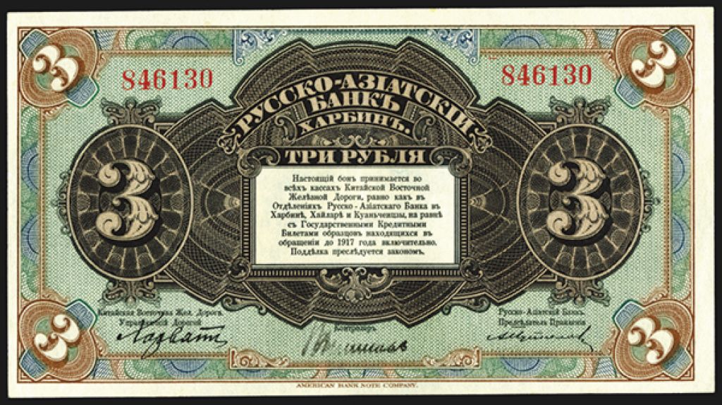 Russo-Asiatic Bank, ND 1917 "Harbin" Issue. China, 3 Rubles, P-S475, S/M#O5-102, Issued banknote, black on green and m/c, back green with locomotive, S/N 846130, AU due to a couple of extremely light folds, otherwise it appears Unc., Attractive note and rare in this high of grade. ABNC. Russo-Asiatic Bank, ND 1917 "Harbin" Issue. China, 3 Rubles, P-S475, S/M#O5-102, Issued banknote, black on green and m/c, back green with locomotive, S/N 846130, AU due to a couple of extremely light folds, otherwise it appears Unc., Attractive note and rare in this high of grade. ABNC.