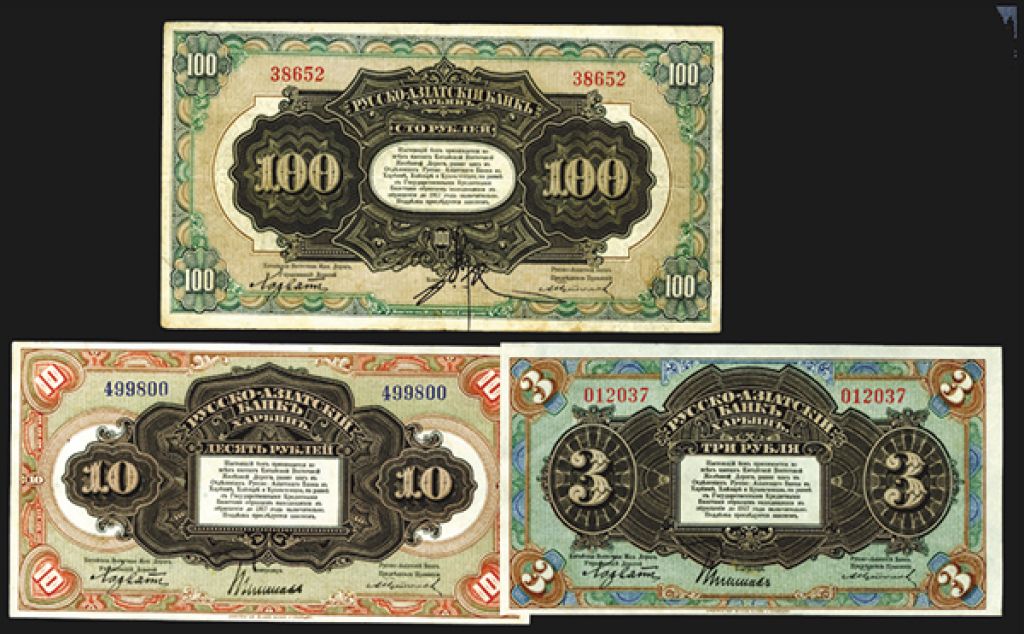 2065 Russo-Asiatic Bank, ND 1917 "Harbin" Issue Banknote Trio. China, Lot of 3 issued notes, all with locomotives on back, Includes 3 Rubles, P-S475, S/M#O5-102, black on green and m/c, back green; 10 Rubles, P-S476, S/M#O5-103, black on brown-orange