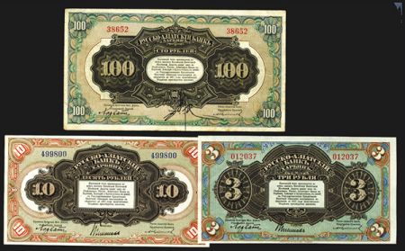 Russo-Asiatic Bank, ND 1917 "Harbin" Issue Banknote Trio. China, Lot of 3 issued notes, all with locomotives on back, Includes 3 Rubles, P-S475, S/M#O5-102, black on green and m/c, back green; 10 Rubles, P-S476, S/M#O5-103, black on brown-orange and m/c, back orange-red, AU to Choice AU with one light vertical fold on left keeping the note from Unc; and 100 Rubles, P-S478a, S/M#O5-105, Issued banknote, black on tan, green and m/c, back brown, VF, Attractive note. ABNC. Russo-Asiatic Bank, ND 1917 "Harbin" Issue Banknote Trio. China, Lot of 3 issued notes, all with locomotives on back, Includes 3 Rubles, P-S475, S/M#O5-102, black on green and m/c, back green; 10 Rubles, P-S476, S/M#O5-103, black on brown-orange and m/c, back orange-red, AU to Choice AU with one light vertical fold on left keeping the note from Unc; and 100 Rubles, P-S478a, S/M#O5-105, Issued banknote, black on tan, green and m/c, back brown, VF, Attractive note. ABNC.