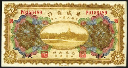 Sino Scandinavian Bank, 1922 "Tientsin" Branch Issue. China. 5 Yuan, S592b, Uncirculated to CU condition. Scarce in high grade. Sino Scandinavian Bank, 1922 "Tientsin" Branch Issue. China. 5 Yuan, S592b, Uncirculated to CU condition. Scarce in high grade.