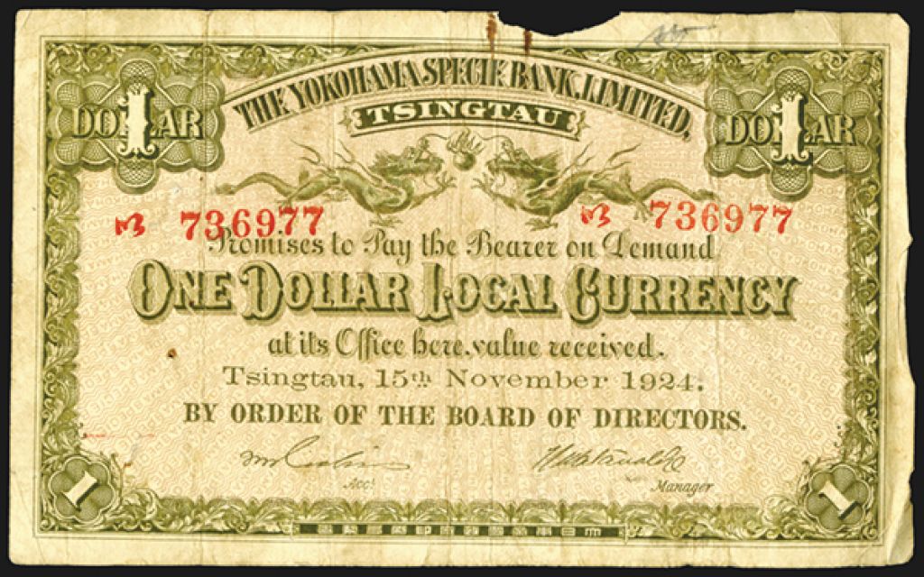Yokohama Specie Bank, Limited, 1924 "Tsingtau" Branch Banknote. China, $1 Local Currency, P-S757, S/M#H31-150, Issued Banknote, Black and violet, Western Serial numbers, Choice VG to Fine condition with a 15mm by 2mm piece missing from the top middle margin, the back had some tape from previous mounting, Rare note in any condition and a difficult branch issue which is unpriced in SCWPM. Yokohama Specie Bank, Limited, 1924 "Tsingtau" Branch Banknote. China, $1 Local Currency, P-S757, S/M#H31-150, Issued Banknote, Black and violet, Western Serial numbers, Choice VG to Fine condition with a 15mm by 2mm piece missing from the top middle margin, the back had some tape from previous mounting, Rare note in any condition and a difficult branch issue which is unpriced in SCWPM.