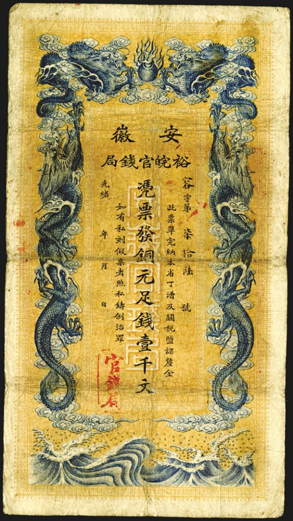 Anhwei Yu Huan Bank, 1909 Cash Issue. China, 1000 Cash, P-S823 S/M#A6-10, Issued banknote, Blue on yellow underprint, Facing dragons at top, back green, VG to Fine condition, Attractive and scarce note. Anhwei Yu Huan Bank, 1909 Cash Issue. China, 1000 Cash, P-S823 S/M#A6-10, Issued banknote, Blue on yellow underprint, Facing dragons at top, back green, VG to Fine condition, Attractive and scarce note.