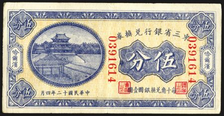 Bank of Manchuria, 1923 Issue Banknote. China, 5 cents, P-S2940a, S/M#T214-150a, Issued banknote, Blue and yellow, back violet and m/c, Choice VF to XF with large even margins, bright colors, sharp corners and firm paper quality. Attractive note for grade. Bank of Manchuria, 1923 Issue Banknote. China, 5 cents, P-S2940a, S/M#T214-150a, Issued banknote, Blue and yellow, back violet and m/c, Choice VF to XF with large even margins, bright colors, sharp corners and firm paper quality. Attractive note for grade.