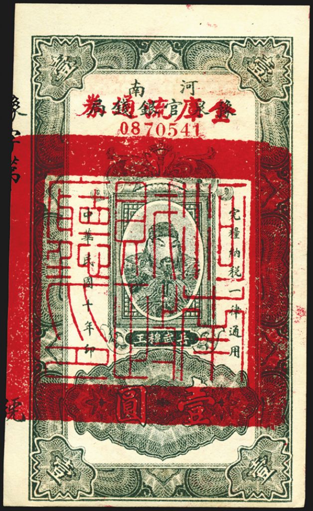 Honan Province Treasury overprinted on Provincial Bank of Honan, 1920's ND Provisional Issued printed on 1921 Issue Banknote. China, 1 Yuan, P-S3855 (Overprinted on P-S2985), S/M#H60-1, Issued banknote, Green, large red overprint on face, Uncirculated to CU condition. Only priced in XF in the SCWPM. Rare and very attractive in high grade. Honan Province Treasury overprinted on Provincial Bank of Honan, 1920's ND Provisional Issued printed on 1921 Issue Banknote. China, 1 Yuan, P-S3855 (Overprinted on P-S2985), S/M#H60-1, Issued banknote, Green, large red overprint on face, Uncirculated to CU condition. Only priced in XF in the SCWPM. Rare and very attractive in high grade.