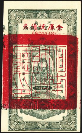 Honan Province Treasury overprinted on Provincial Bank of Honan, 1920's ND Provisional Issued printed on 1921 Issue Banknote. China, 1 Yuan, P-S3855 (Overprinted on P-S2985), S/M#H60-1, Issued banknote, Green, large red overprint on face, Uncirculated to CU condition. Only priced in XF in the SCWPM. Rare and very attractive in high grade. Honan Province Treasury overprinted on Provincial Bank of Honan, 1920's ND Provisional Issued printed on 1921 Issue Banknote. China, 1 Yuan, P-S3855 (Overprinted on P-S2985), S/M#H60-1, Issued banknote, Green, large red overprint on face, Uncirculated to CU condition. Only priced in XF in the SCWPM. Rare and very attractive in high grade.