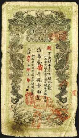 Hunan Government Bank, Yr.30 (1904) Tael Issue Banknote. China, 1 Tael, P-S1904, S/M#H161-4, Issued banknote, black on green, back orange, facing dragons, Choice VG with 2 small spindle holes as usual in the middle. Scarce note in any condition. Hunan Government Bank, Yr.30 (1904) Tael Issue Banknote. China, 1 Tael, P-S1904, S/M#H161-4, Issued banknote, black on green, back orange, facing dragons, Choice VG with 2 small spindle holes as usual in the middle. Scarce note in any condition.
