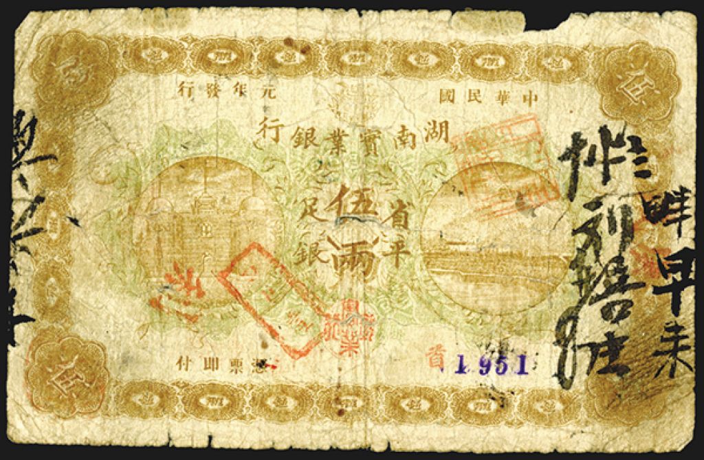 Hunan Industrial Bank, 1912 "Taels" Issue Banknote Rarity. China, 5 Taels, P-S1997, S/M#H165-2, Issued banknote, Face Green and Brown with office building on left and mountains at right, back blue on light green, S/N 1951, VG condition with a lot of graffiti on the back, tape remnants on top margin, a small 3mm by 5mm piece missing from the top left margin, small edge faults, still extremely rare and first time offered by us. Hunan Industrial Bank, 1912 "Taels" Issue Banknote Rarity. China, 5 Taels, P-S1997, S/M#H165-2, Issued banknote, Face Green and Brown with office building on left and mountains at right, back blue on light green, S/N 1951, VG condition with a lot of graffiti on the back, tape remnants on top margin, a small 3mm by 5mm piece missing from the top left margin, small edge faults, still extremely rare and first time offered by us.