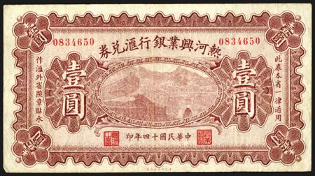 Industrial Development Bank of Jehol, 1925 Banknote. China. 1 Yuan, P-S2186a S/M#J1-70a, Issued banknote, Great Wall at center, VF, Attractive. BEPP. Industrial Development Bank of Jehol, 1925 Banknote. China. 1 Yuan, P-S2186a S/M#J1-70a, Issued banknote, Great Wall at center, VF, Attractive. BEPP.