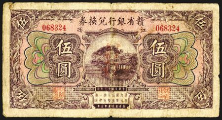 Kan Sen Bank of Kiangsi, 1924 Issue Banknote. China, $5, P-S2226 (S/M#K2-2), Issued banknote, Violet on m/c, S/N 068324, Fine to Choice Fine condition, Scarce note in any condition. Kan Sen Bank of Kiangsi, 1924 Issue Banknote. China, $5, P-S2226 (S/M#K2-2), Issued banknote, Violet on m/c, S/N 068324, Fine to Choice Fine condition, Scarce note in any condition.