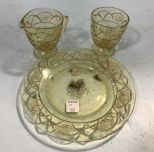 "Rose Pattern" Depression Glass, sugar and creamer, matching dinner plate 9 1/2"dia., light yellow, needs cleaning. "Rose Pattern" Depression Glass, sugar and creamer, matching dinner plate 9 1/2"dia., light yellow, needs cleaning.