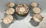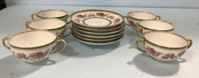 France "Boston" Broth Bowl and Saucers, double handles, one bowl is cracked, 12 total. France "Boston" Broth Bowl and Saucers, double handles, one bowl is cracked, 12 total.