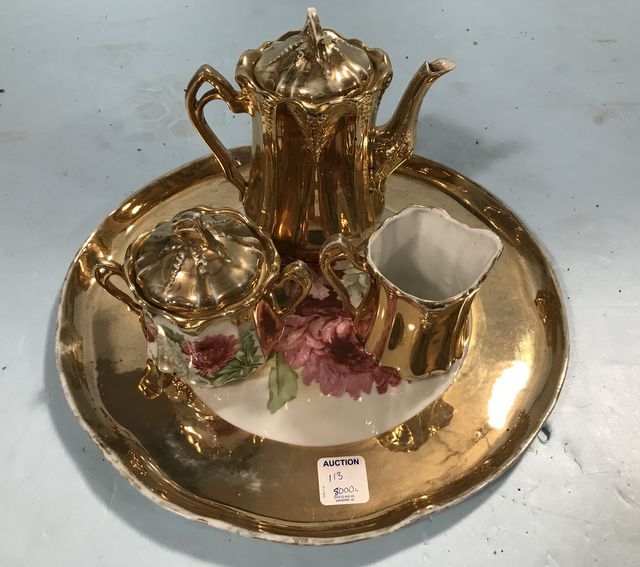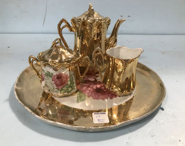 Gold Painted Porcelain Tea Set, pitcher, sugar, creamer, and tray 12"dia,. Has some age wear. Gold Painted Porcelain Tea Set, pitcher, sugar, creamer, and tray 12"dia,. Has some age wear.