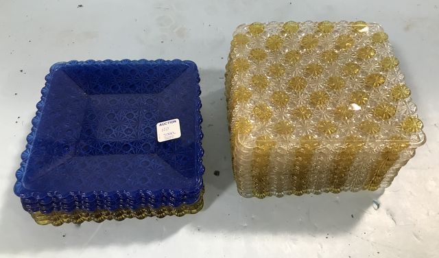 4 cobalt blue and 11 yellow/clear and 3 amber, 18 total, 7"sq. 4 cobalt blue and 11 yellow/clear and 3 amber, 18 total, 7"sq.