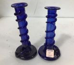 Pair of Cobalt Blue Pontil Candle Sticks glass, swirl ring of raised glass top to bottom, 6"h. Pair of Cobalt Blue Pontil Candle Sticks glass, swirl ring of raised glass top to bottom, 6"h.