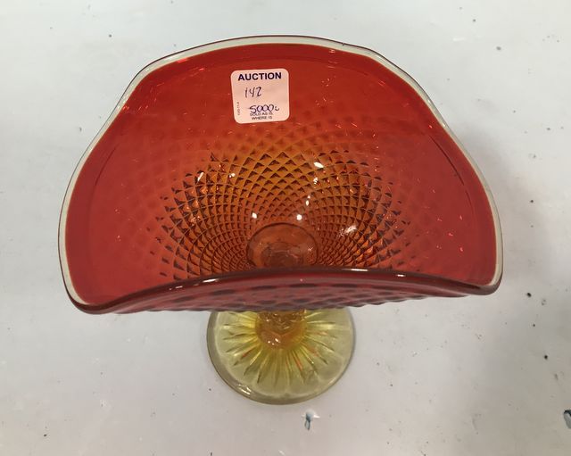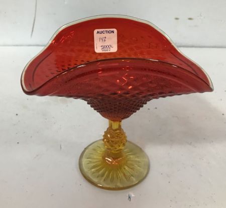 Red Crested Candy Dish, amber, sides flared, diamond decor, 6"h. Red Crested Candy Dish, amber, sides flared, diamond decor, 6"h.