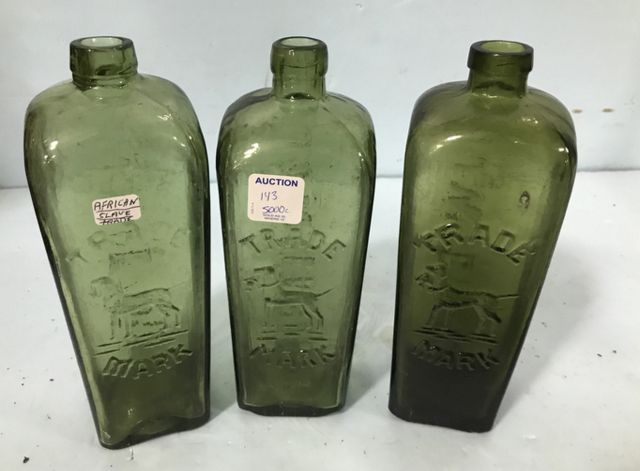 Three Green Dogs "Trademark" Bottles, African trade bottles, 8"h. Three Green Dogs "Trademark" Bottles, African trade bottles, 8"h.
