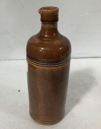 Brown glaze, rings at shoulder and base-lip spout merchant's name stamped, 10"h. Brown glaze, rings at shoulder and base-lip spout merchant's name stamped, 10"h.