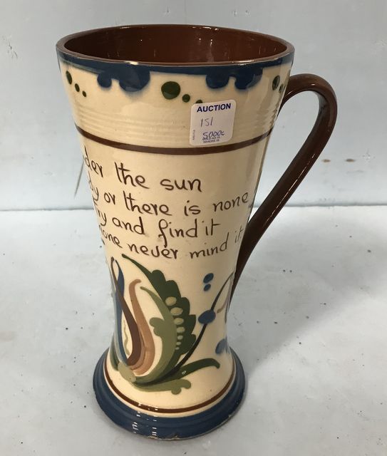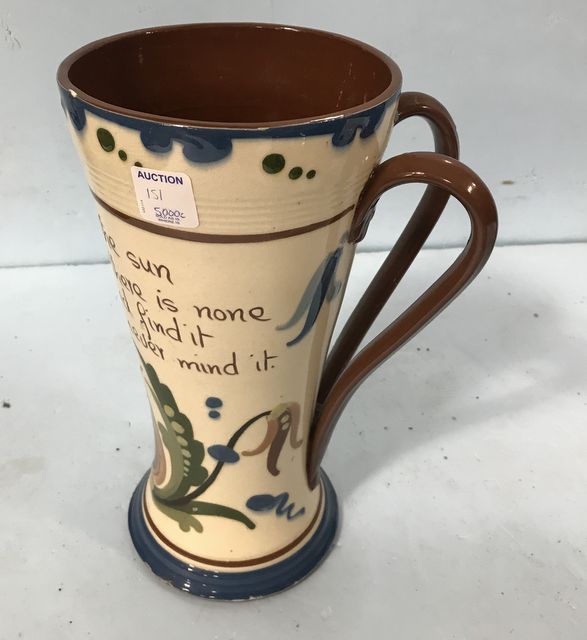 Two together handled, tall motto ware mug, 11"h, flared tip, pinched body. Two together handled, tall motto ware mug, 11"h, flared tip, pinched body.