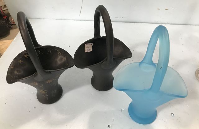 Blue satin glass Tiffin basket, Black tiffin basket hand painted flowers, black tiffin basket, 10 1/2"h. Blue satin glass Tiffin basket, Black tiffin basket hand painted flowers, black tiffin basket, 10 1/2"h.