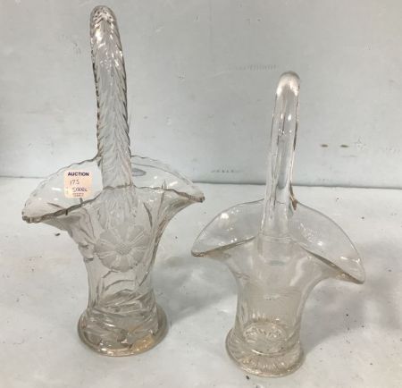Etched fancy basket, handle and lip 12"h., Helsey etched basket 10"h. Etched fancy basket, handle and lip 12"h., Helsey etched basket 10"h.