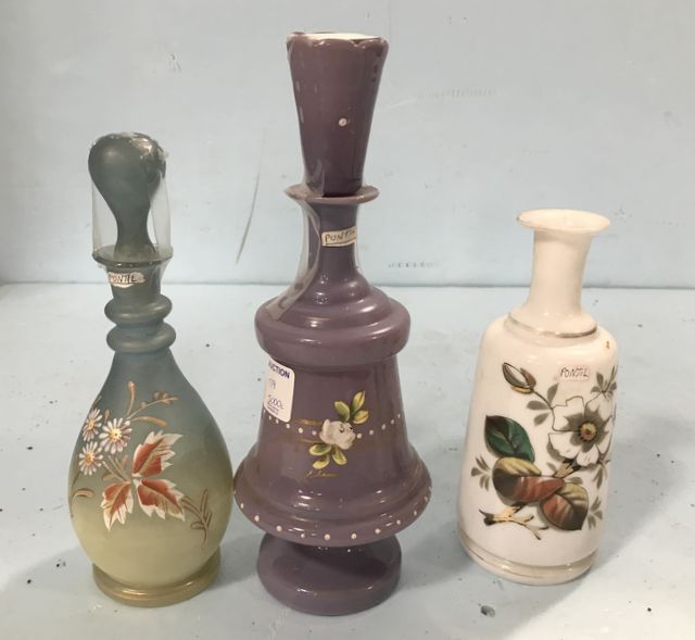 Three Hand Painted Glass Dresser Bottles, pontil, with 2 stoppers, tallest is 10 1/2"h. Three Hand Painted Glass Dresser Bottles, pontil, with 2 stoppers, tallest is 10 1/2"h.