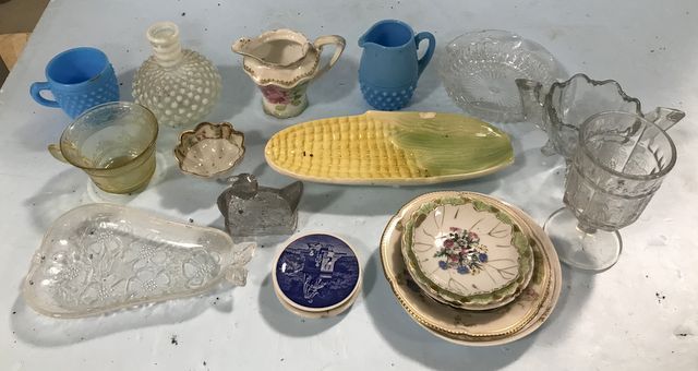 Hobnail pieces, glass cups, glass dishes, hand painted plates, corn dish with chip, rooster glass, porcelain creamer, footed dish. Hobnail pieces, glass cups, glass dishes, hand painted plates, corn dish with chip, rooster glass, porcelain creamer, footed dish.