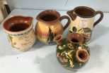 "Cottage" motto ware teapot 4"h., spout green pot "Scandy" 4"h., Rosey Sunset sailing ship cream pitcher 4"h., Scandy cream pitcher, motto ware 4"h. "Cottage" motto ware teapot 4"h., spout green pot "Scandy" 4"h., Rosey Sunset sailing ship cream pitcher 4"h., Scandy cream pitcher, motto ware 4"h.