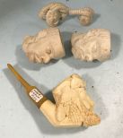 Meacham face pipe, old and used, 6"L., pair of African American unused face pipes, no stems, pair of claw pipes. Meacham face pipe, old and used, 6"L., pair of African American unused face pipes, no stems, pair of claw pipes.