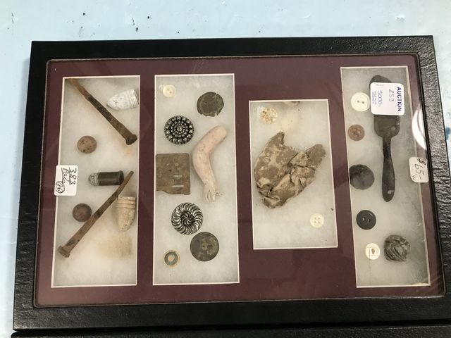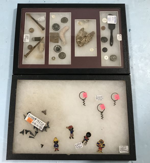 253 Small Cases of Civil War Artifacts and Shark Teeth, Cork Screws, Pins