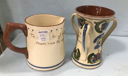 Mottoware Allervale 3 handled Tyg, Cottage cream pitcher mottoware pottery Dartmouth, 6"h. Mottoware Allervale 3 handled Tyg, Cottage cream pitcher mottoware pottery Dartmouth, 6"h.