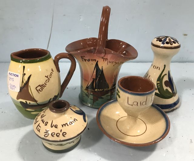 Basket 7"h., creamer, sailing boats, ink, egg cup, hat pin holder Scandy. Basket 7"h., creamer, sailing boats, ink, egg cup, hat pin holder Scandy.