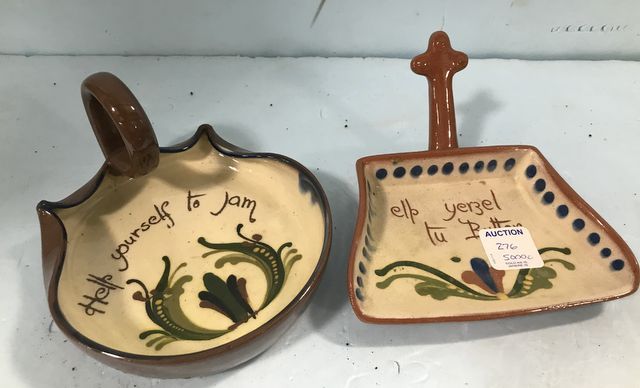 Scandy jam and butter dishes mottoware pottery Watcome, 4"w. Scandy jam and butter dishes mottoware pottery Watcome, 4"w.