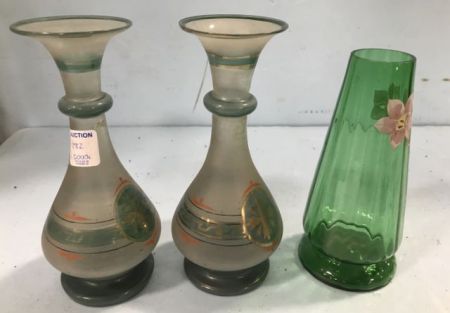Pontil pair and single hand painted flower design vase, 8"h. Pontil pair and single hand painted flower design vase, 8"h.