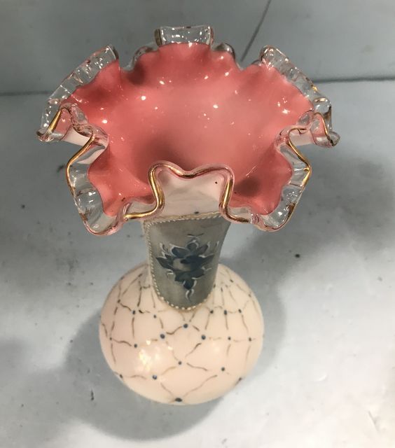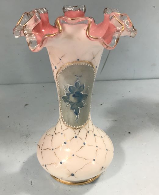 Fenton Crested Milk Glass Vase, hand painted, blue flower, 9"h. Fenton Crested Milk Glass Vase, hand painted, blue flower, 9"h.