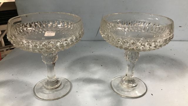 Matching Pair Pressed Glass Candy Dishes, long foot, 7 1/2"h. Matching Pair Pressed Glass Candy Dishes, long foot, 7 1/2"h.