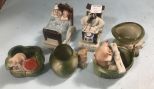 Four antique German pigs, wash tub with baby, "Boston Baked Beans" pot, high hat, 3"h., and 1900's Fairings, couple in bed, 3"h. Four antique German pigs, wash tub with baby, "Boston Baked Beans" pot, high hat, 3"h., and 1900's Fairings, couple in bed, 3"h.